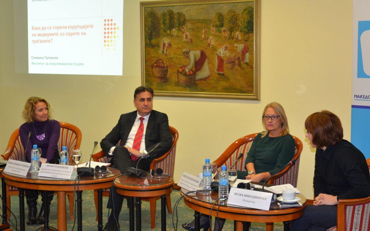 Snezana Trpevska from the Institute of Communication Studies in Macedonia, Miroslava Milenovic, member of the Anti-corruption Council of Serbia, and Zoran Trajcevski, Director of the Agency for audio and audiovisual media services in Macedonia (AAVMS) highlighted the role of state institutions in the protection of media integrity. According to Trpevska, current media policy does not provide conditions for the existence of diverse, independent and autonomous media. She said that media ownership pluralism is observed only on the formal level, while in practice hidden ownership is often connected to the governing structures. The representative of the Anti-corruption Council of Serbia said that it is impossible to successfully combat corruption, without independent media as watchdogs over the government actions. She emphasized that their reports confirm the link between public money and the editorial policy of the media in Serbia. The director of AAVMS addressed the media legislation in Macedonia and the responsibilities of the Agency in ensuring media integrity.