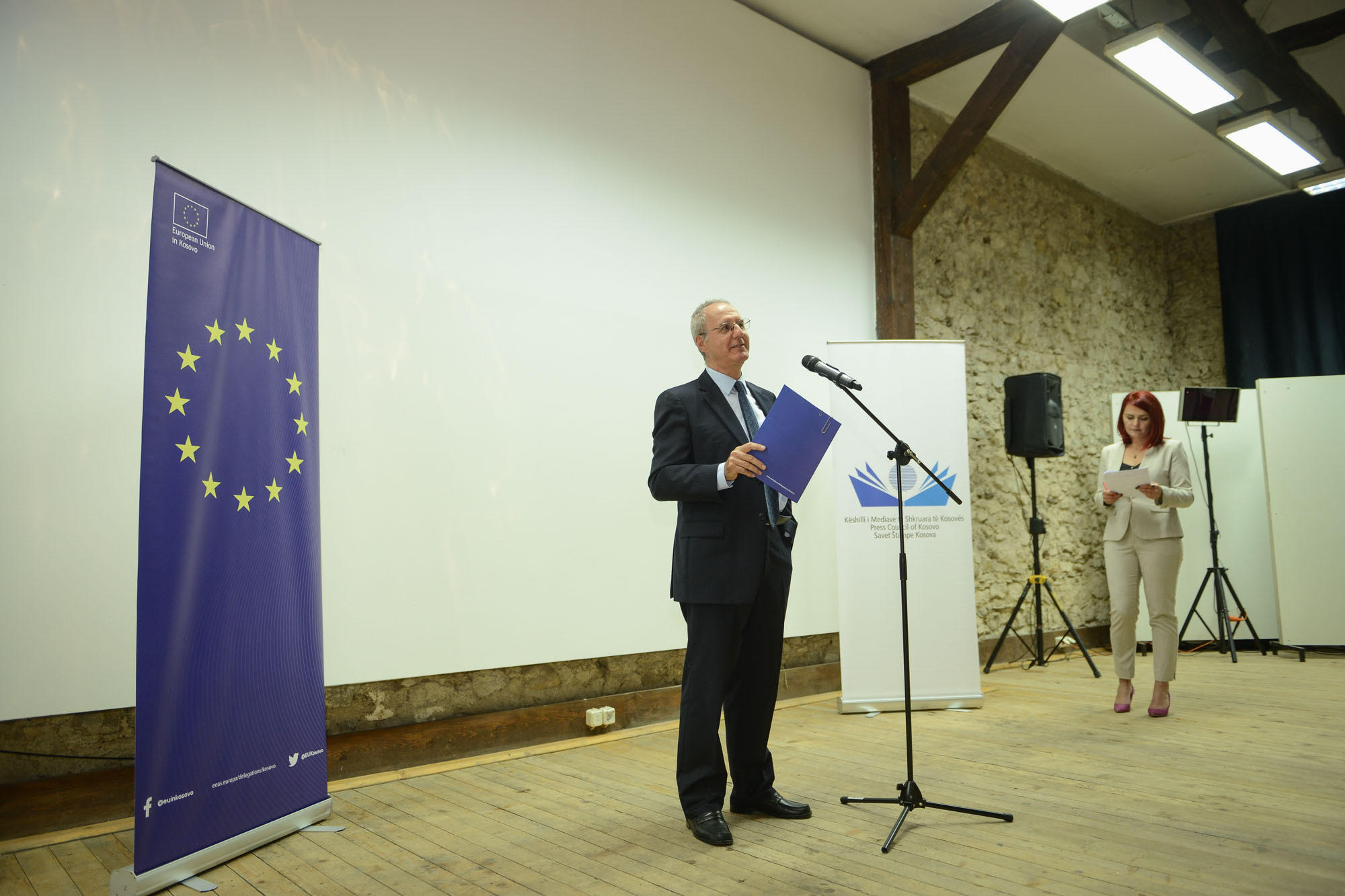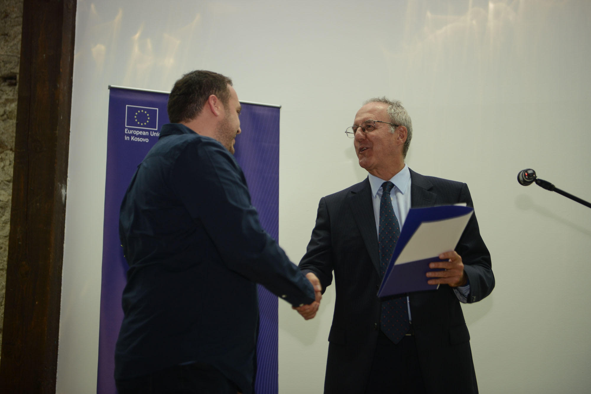 On May 4, 2017, in Prishtina, Press Council of Kosovo gave three prizes for the EU Award for Investigative Journalism. Leonard Kerquki, journalist at Gazeta Express, is awarded the first price for the investigative story “Shtabi i Milionerëve (The Headquarters of Millionaires). The prize was handed by Luigi Brusa, Head of Cooperation Section in the EU Office in Kosovo. Jury’s justification pointed out the relevance, quality and impact of the story: Shtabi i milionerëve (The Headquarters of Millionaires) reveals the rapid enrichment of sevreal persons - part of the Kosovo Liberation Army UÇK (KLA) - today leaders of high institutions and political parties. The story generated a thorough debate in public, exposing important facts that show the way these people were enriched.
