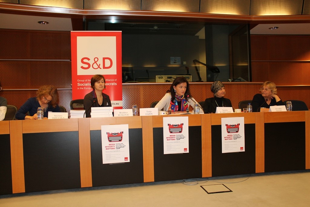The conference was held on 18 November 2014, with MEP Tanja Fajon highlighting in the introduction the importance of the media for democracy and supporting the positive role the European Union in promoting these values within the EU and in the EU-enlargement countries. The presentation of the media integrity research then started with regional overview by Brankica Petković, lead researcher and project coordinator of the SEE Media Observatory who also briefly elaborated key media integrity issues in Albania, Bosnia and Herzegovina and Croatia. It was followed by two more detailed country presentations: on media integrity situation in Macedonia by Snežana Trpevska, Assistant Professor at the School of Journalism and Public Relations in Skopje, and on media integrity situation in Serbia by Jovanka Matić, researcher at the Institute for Social Sciences in Belgrade, both being part of the SEE Media Observatory research team, engaged by the partners of the SEE Media Observatory – Macedonian Institute for Media and Novi Sad School of Journalism. The presentation was concluded with the contribution of Sandra Bašić Hrvatin, Professor at the University of Primorska in Slovenia, member of the Advisory Board of the SEE Media Observatory and co-author of the regional overview for the research report “Media Integrity Matters”, on the European perspective of the media integrity problems.