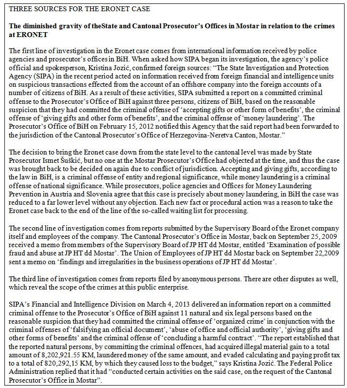 Police agencies from Austria, Slovenia and BiH, the Office for Money Laundering Prevention from Slovenia, the State Investigation and Protection Agency of BiH, the Federal Police Administration, and the Financial Police of the Federation of BiH have all so far worked on the case. The national offices of Interpol in Sarajevo and Ljubljana exchanged more than 100 documents in mutual communication on the matter. The Audit Office of the Institutions of the Federation of BiH has for years been issuing a negative evaluation of business operations of two public enterprises involved in the case (Public Enterprise HT Eronet and Public Enterprise RTV Federation of BiH), questioning the transparency and legality of their financial and marketing operations.