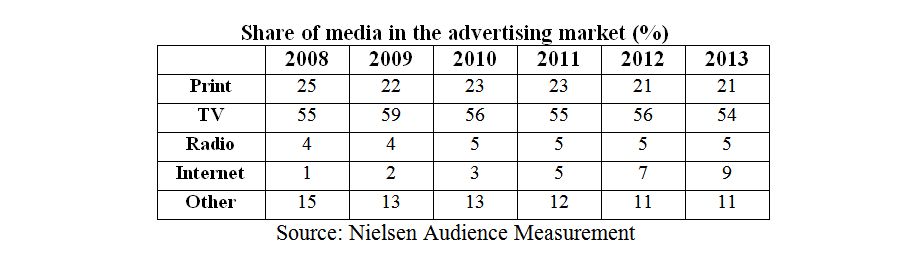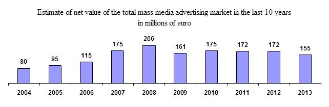 The Serbian advertising market cannot sustain all of the existing 1300 media. Most of them operate at a loss. Being among the poorest ones in Europe, with about 170 million euros for several years, the advertising market shrank to 155 million in 2013,1 putting the media into an even more difficult economic position and increasing their dependence on advertising income to the point of survival.