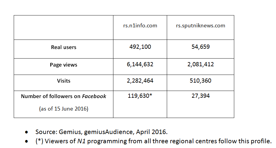 In April 2016, the rs.n1info.com website received 2,282,464 visits, while rs.sputniknews.com received 510,360. N1 uses its Facebook account to gather the viewers of its channels from all three major regional centres. The account has 119,630 followers, while 27,394 users follow Sputnik Srbija’s account (See: Supplement 1).