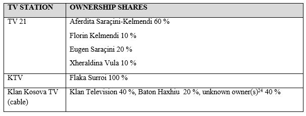 It seems that the IMC has not yet been brought up to date on the ownership changes in Klan Kosova TV. According to current official data from the IMC, the owner of this broadcaster is still Aleksander Frangaj,23 the owner of TV Klan from Albania.