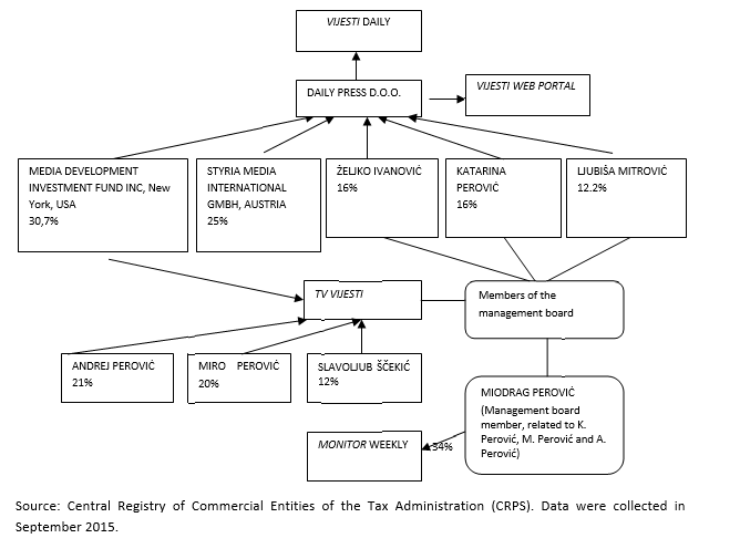 New rules on media concentration introduced by the Electronic Media Law (2010) have been successfully applied, as seen in the case of TV Vijesti and Daily Press, a publisher of the daily Vijesti. In order to comply with the law, the owners transferred the shares mostly to their relatives, employees and other connected persons, but they kept their management position (see Chart 6).