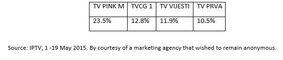 The pattern of political clientelism can also be observed in the data compiled by the National Electoral Commission on the political parties’ expenditures for media campaigns for the local elections held in 2014.24 According to that report, the opposition parties clearly supported TV Vijesti, while on the other hand, the ruling Democratic Party of Socialists (DPS) spent their entire advertising funds in TV Prva and TV Pink M, whose editorial policy is close to the government.