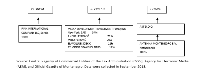 Both TV Pink M and TV Prva entered the market as affiliates of Serbian channels, belonging to larger regional media groups – Pink Media Group, owned by Serbian media entrepreneur Željko Mitrović and Antenna Group, a media corporation founded by the Greek capital. The owners of the latter are not known to the Montenegrin public. The television operates under the company Antenna Montenegro BV, located in Amsterdam and managed by foreign individuals. According to data of the Netherlands company register,5 Antenna Montenegro BV is a granddaughter company of Antenna Group BV, registered as a financial holding, with 18 connected companies.