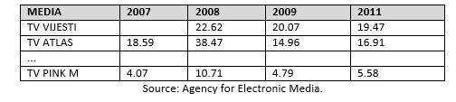While the state allocates the advertising funds to media with no consideration for the economic criteria in an already oversaturated market, the concept of support to media pluralism seems a pretence. Boris Marić, an expert from the CCE, argues that the state, already financing public service media, additionally contributes to the dispersion of the media market by giving considerable advertising funds to low-rating media at the expense of those which could have the chance to be sustainable.26