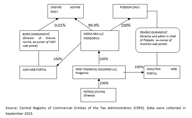 Competition to Vijesti and Dan started to build up in 2011 with the entrance of Greek capital in the media market. What started as a "completely independent business project" of start-up company Media Nea – daily Dnevne novine,10 turned out to be the beginning of major investment of a foreign businessman already present in Montenegro. While the sole reported founder of Media Nea was Boris Darmanović, the media, however, speculated that the real investor in this media venture was a Greek businessman Viktor Restis, tenant of the Montenegrin luxury resort Sveti Stefan.11 Although Darmanović refuted these reports, as of 2013, the Central registry of commercial court reports showed that the company First financial holdings, owned by Greek businessman Petros Stathis, a partner of Restis in Sveti Stefan resort, became the owner of 99,9 percent of the company. Two years later the same company bought the bankrupt state owned daily Pobjeda, turning both of these media into the greatest supporters of the government's agenda.
