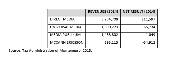 There are no official data on the size of the advertising market in Montenegro. The best estimate is that it is worth around 9 million euro. According to the estimates, 80 percent of the financing is distributed through the agencies specialized in media advertising, and only 20 percent is negotiated directly between the advertisers and the media.27 Available data on the revenues of advertising agencies have shown that the top four agencies have cashed in over 7 million euro, largely confirming this estimate.