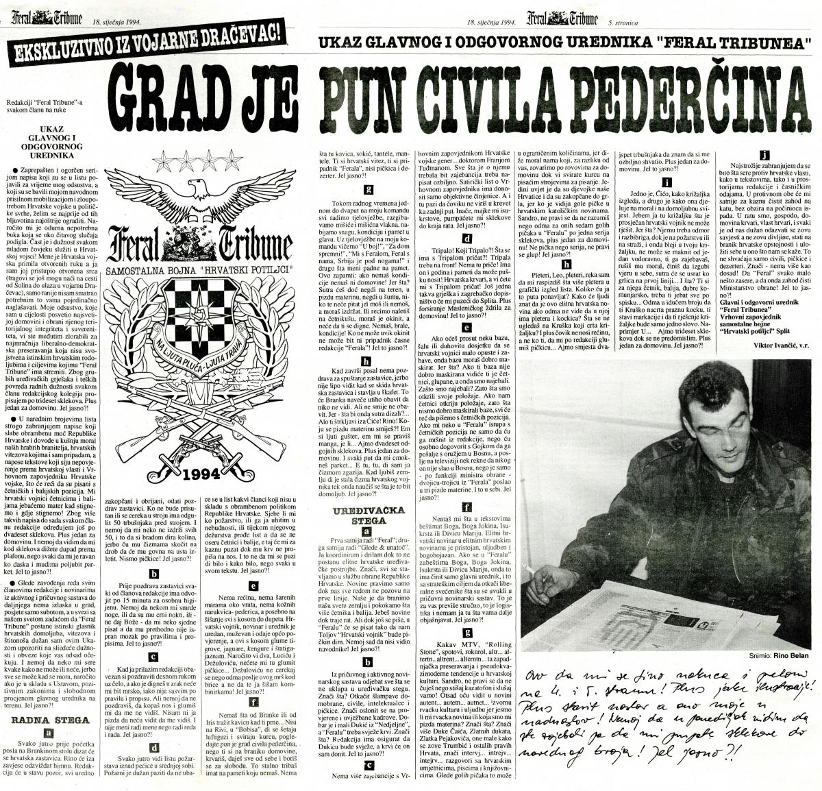 In December 1999, Feral journalist Toni Gabrić was taken into custody for “watching” the villa of Đurđa Šušak, wife of then deceased minister of defense Gojko Šušak: a military policeman in the street took away his documents, after which he brought him into the basement of the villa and with six other colleagues “questioned” him for a full two hours. Editor-in-Chief Heni Erceg sent a public letter of protest to the Ministry of Defense, seeking an explanation, but no response arrived... Ivica Đikić was also subjected to thorough police questioning after publishing in March 2003 documents labeled “military secret”, which had been covered up for years, about the evaporation and burning of more than two tons of the deadly hydrogen cyanide gas in the “Duboki jarak” military warehouse near Sesvete… That was just a continuation of an old practice: when the General Attorney’s Office in 1996 pressed charges against Feral columnist Marinko Čulić and the signatory of these lines for “libel and slander” of then President of the state Franjo Tuđman, they were interrogated in police premises, indicatively, by inspectors of the “Department for War Crimes and Crimes of Terrorism”.
