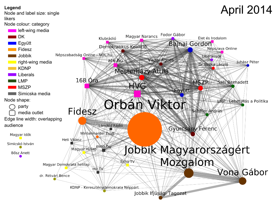 On the level of parties, the usual political cleavages can be seen: the well-connectedness of the governing Fidesz–KDNP; the outsiderness of the extreme right-wing Jobbik; and the fact that the democratic opposition shares the same audience. Among the party fanpages, that of Viktor Orbán and Fidesz are the most popular, followed by that of Jobbik.