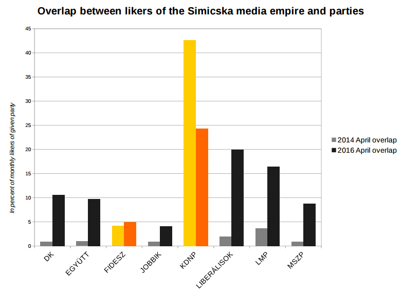 This paper does not aim at controlling for everything. For instance we have not had a deep analysis of content published by the fanpages; we do not know how the reach of the fanpages have changed, etc. However, we also had a look at the overlap between the likers of the analysed Simicska fanpages between 2014 and 2016 and we have found that only ten percent of the 2016 likers were liking content on the same pages in 2014. For comparison, in case of Fidesz there was was 38 percent of same likers in both years.