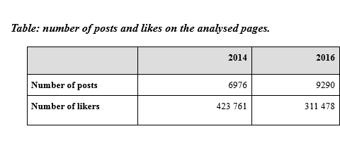 Current research was not aiming at revealing spurious correlations. The results should not be generalized without a more comprehensive research. The data does not indicate how many people started following or left the fanpages, and are the same users active in 2014 and 2016, and how the reach of the fanpages have changed. For further research it would be worth to analyse longer periods of time in order to exclude seasonality, and of course more fanpages could be added to the analysis. In-depth analysis of the content that was published by the fanpages would provide more insights in the user behaviour.